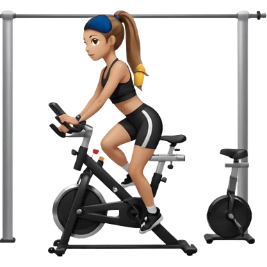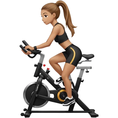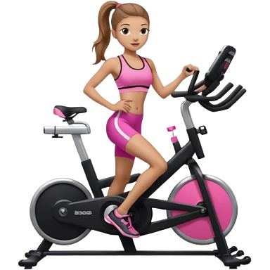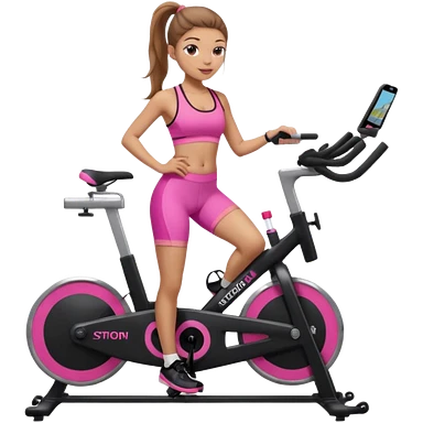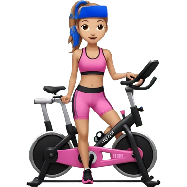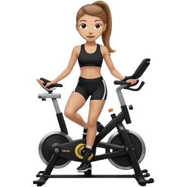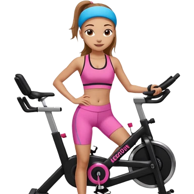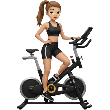 Light skin girl with long light brown hair in a pony tail, black workout set leaning on a indoor spin bike with NO HELMET, emoji