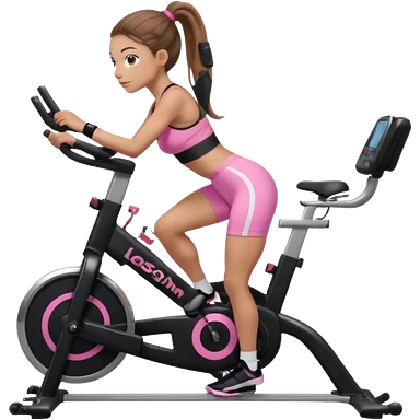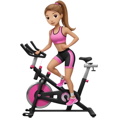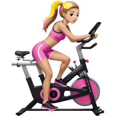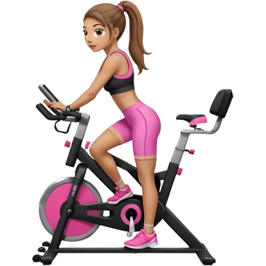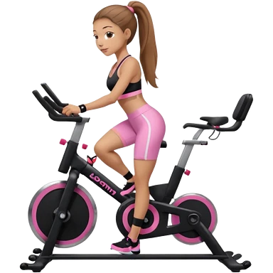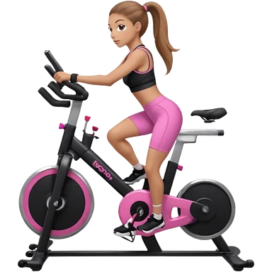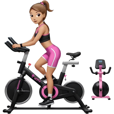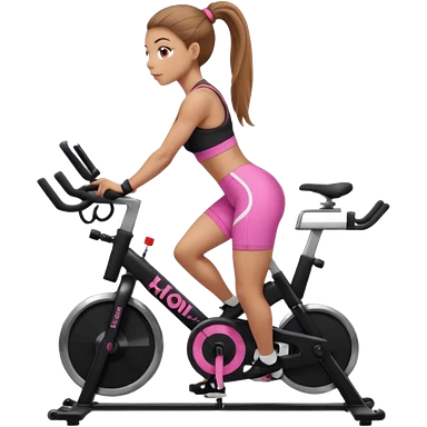 Light skin girl with long light brown hair in a pony tail, black workout set leaning on a indoor spin bike with NO HELMET, can we add a pink sports bra emoji