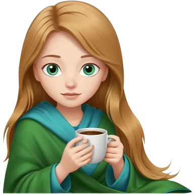 A girl with blue eyes, long eyelashes, very long light brown hair, inside a green blanket with coffee emoji