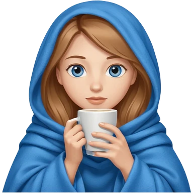 A girl with blue eyes, long eyelashes, very long light brown hair, inside a blue blanket with coffee emoji
