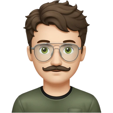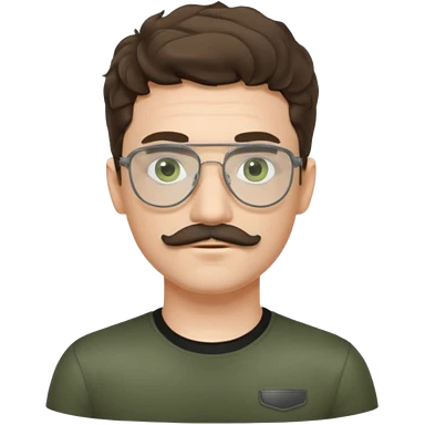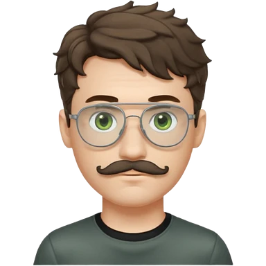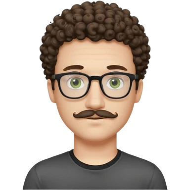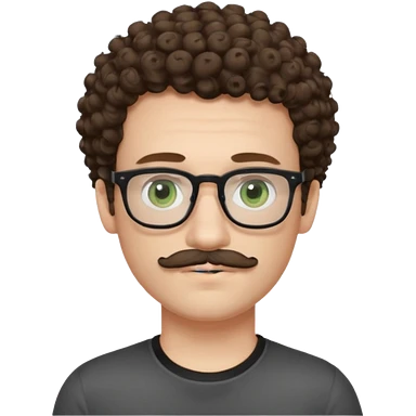 Light brunette curly haired young man with pale skin and glasses. Eyes are greenish grey and he has a moustache. Black t-shirt.emoji