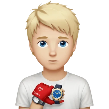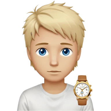 create boy blonde hair long messy, light eyes, white t shirt, rich, long hair, eyes blue, acessory rolex or cartier emoji