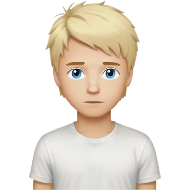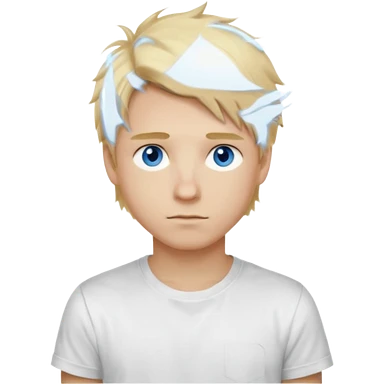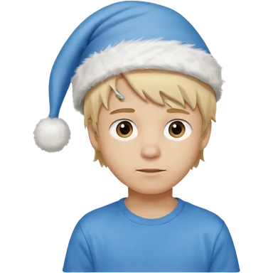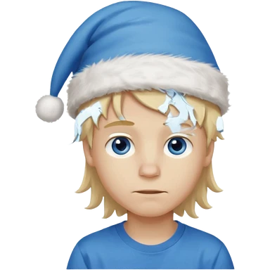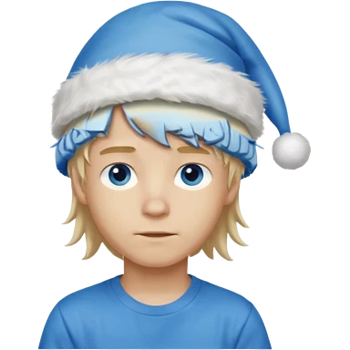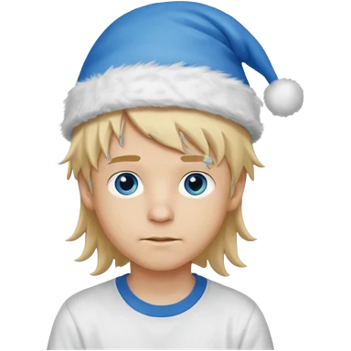 create boy blonde hair long messy, light eyes, white t shirt, rich, long hair, eyes blue, acessory head cristimas blue hat emoji