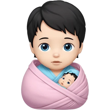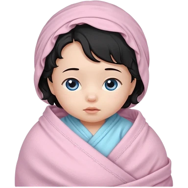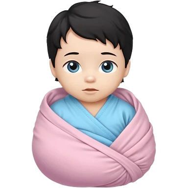 a asian newborn baby with black wavy hair and blue eyes wrapped in a light pink swaddle emoji