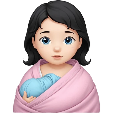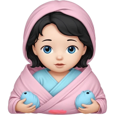 a female asian newborn baby with black wavy hair and blue eyes wrapped in a light pink swaddle emoji