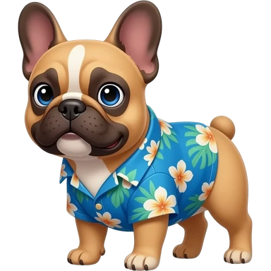 “Emoji style French Bulldog (not a generic dog). Light brown/fawn color, blue eyes, white chest patch. Bat ears, flat snout. Wearing a blue tropical floral shirt. Head slightly tilted, cute expression. Keep same dog face from photo. Clean emoji style.” emoji