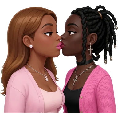 Bimbo, pearl earrings stud, Light pink cute lips, black eyebrows, long honey brown hair, dark brown skin, playboy necklace with lashes, light pink cardigan shirt, kissing the goth black girl with pink cardigan shirt, with brown skin, cross earrings, ankh necklace with black dreadlocks emoji