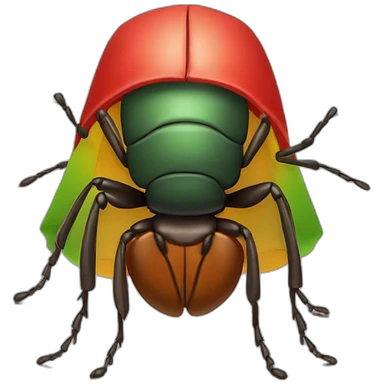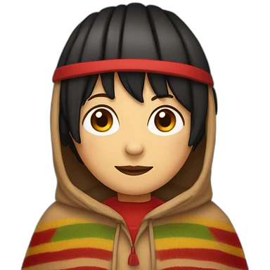 full view of a light brown bedbug with a red headband, shoulder-length black hair down to the ears. It is dressed in a red poncho (with red, yellow and green vertical lines) emoji