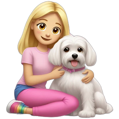 A girl with blonde hair in a ligh pink T-shirt and rainbow leggings hugs a maltese dog emoji