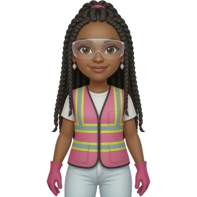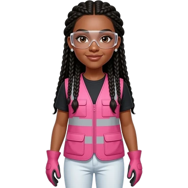 Light skin woman with brown eyes with long black box braids wearing diamond earrings wearing pink and clear safety glasses wearing a pink construction vest wearing white pans wearing pink construction vest wearing white pants wearing pink construction gloves emoji