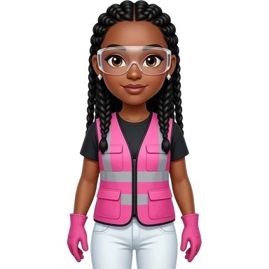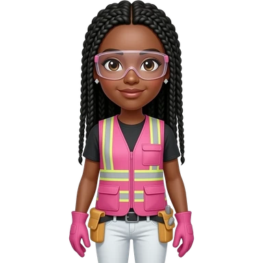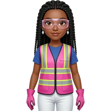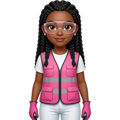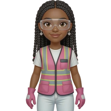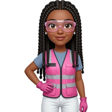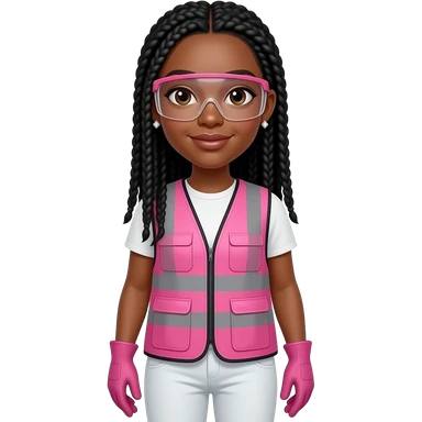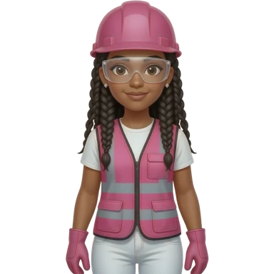 Light skin complextion woman with brown eyes with long black box braids wearing diamond earrings wearing pink and clear safety glasses wearing a pink construction vest wearing white pans wearing pink construction vest wearing white pants wearing pink construction gloves emoji