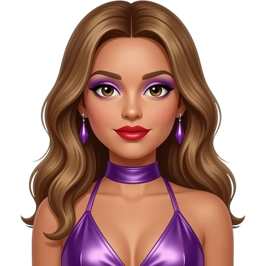 Melody Thornton from The Pussycat Dolls with medium dark skin, dark brown eyes, long light brown 2000s hair, purple eyeshadow, red lipstick, purple metallic halter dress, earrings emoji