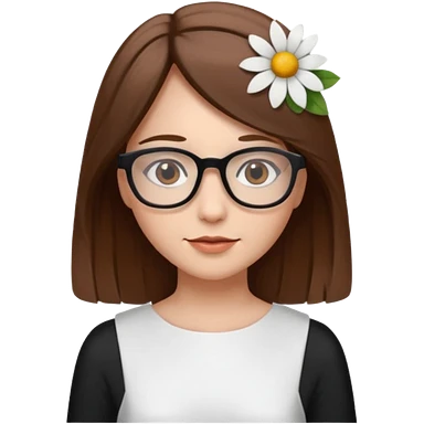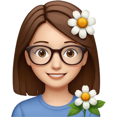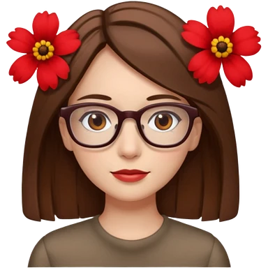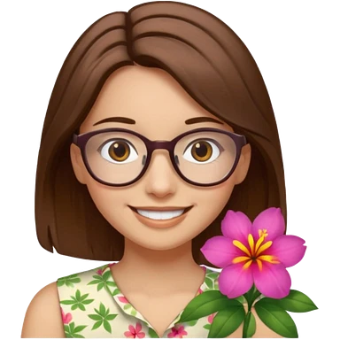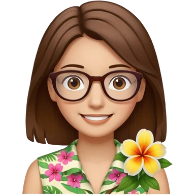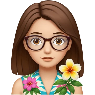 female with white skin. Shoulder length straight brown hair. Brown eyes with glasses. Hawaiian Flower in hair emoji