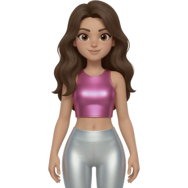 Azzyland with light skin, brown eyes, long dark brown hair, pink metallic crop top, white metallic leggings emoji