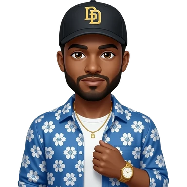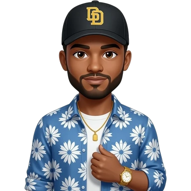 Light skin tone man with light shaved black beard and brown eyes wearing a blue long sleeve with white floral leaf type pattern designs on it button down shirt unbuttoned with a white t shirt wearing a gold tennis necklace wearing a gold wrist watch wearing a black San Diego Padres logo baseball cap emoji | AI Emoji Generator