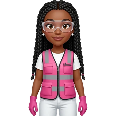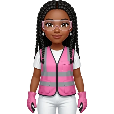 Light skin woman with brown eyes with long black box braids wearing diamond earrings wearing pink and clear safety glasses wearing a pink construction vest wearing white pans wearing pink construction vest wearing white pants wearing pink construction gloves emoji | AI Emoji Generator