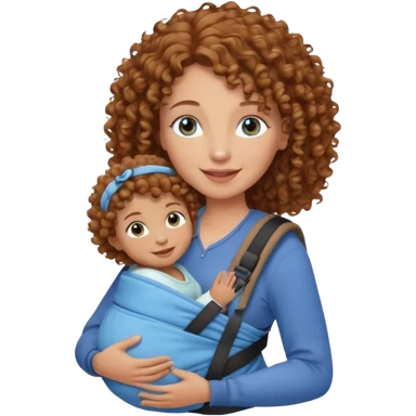 Caucasians light brown curly haired woman with brown skinned bay in carrier. Mom has blue eyes emoji
