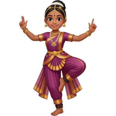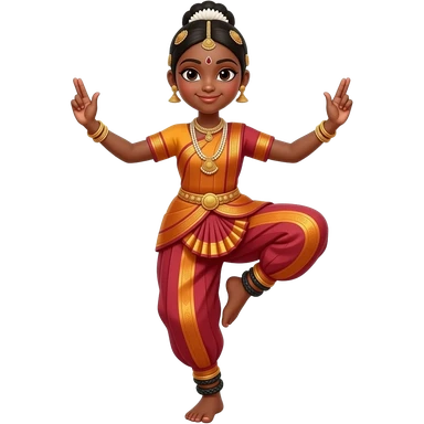 Light brown skin girl in a bharatnataym dress left hand lifting up left foot and right hand lifted up in the air a little bent in aramundi emoji