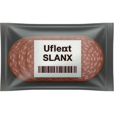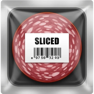 A package of pre-sliced salami in vacuum-sealed clear plastic, centered on a solid matte black background. Minimalist white sticker label with bold black sans-serif text and a barcode. Clean, flat lay aesthetic with studio lighting and high-end grocery branding emoji