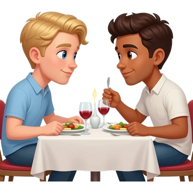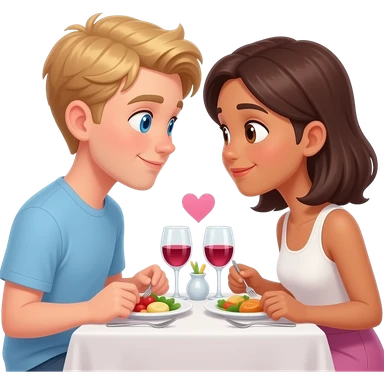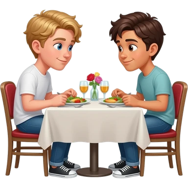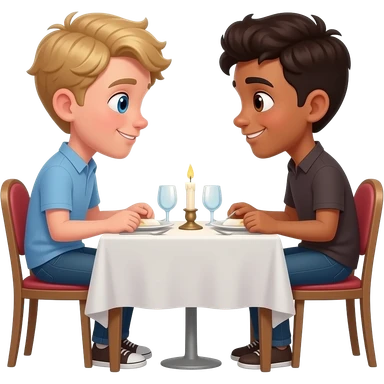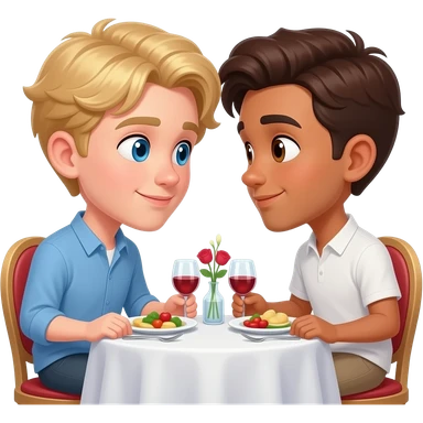 Make a young gay male teen couple on a Date , one has light Skin with Blond Hair and Blue Eyes, the other one has slightly brown skin witz dark Brown Hair and Brown Eyes. They are on a date having dinner. They look at each other in love. emoji