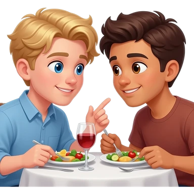 Make a young gay male teen couple on a Date , one has light Skin with Blond Hair and Blue Eyes, the other one has slightly brown skin witz dark Brown Hair and Brown Eyes. They are on a date having dinner. They look romantic at each other in love. emoji