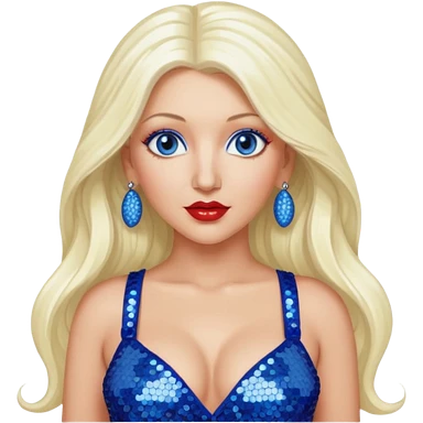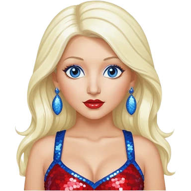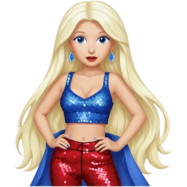 Christina Aguilera with long platinum blonde hair, periwinkle sequin crop top, red sequin pants, blue eyes emoji
