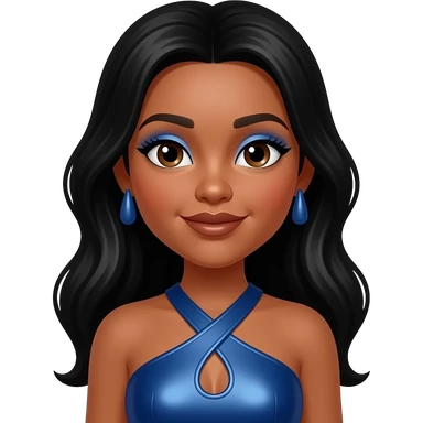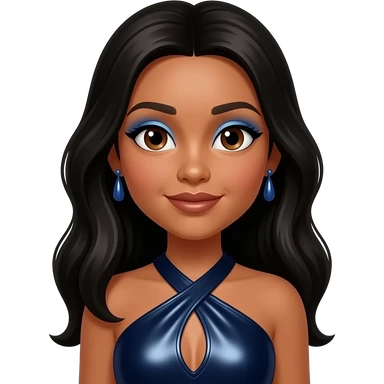 Millie from The Next Kidz with medium skin, brown eyes, long black hair, blue eyeshadow, brown lipstick, dark blue metallic halter dress, blue earrings emoji