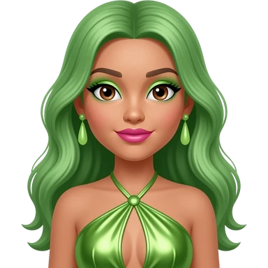 RiRi.Realness from The Next Kidz with light medium skin, brown eyes, long green hair, lime green eyeshadow, pink lipstick, lime green metallic halter dress, light green earrings emoji