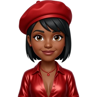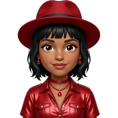 Ny from The Next Kidz with dark brown skin, dark brown eyes, black tomboy hair, red hat, red metallic open dress shirt, red necklace and earrings emoji