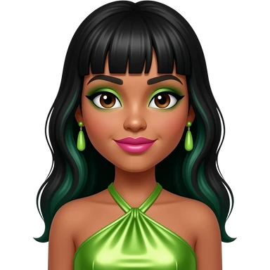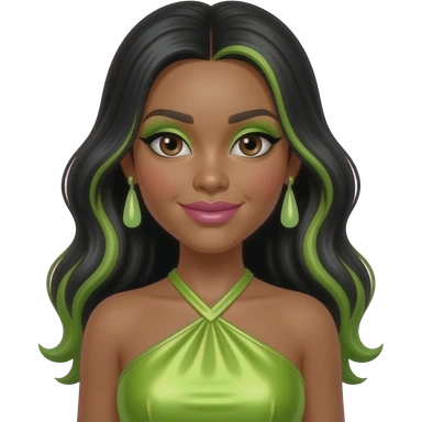 RiRi.Realness from The Next Kidz with medium skin, brown eyes, long black hair with green highlights, lime green eyeshadow, pink lipstick, lime green metallic halter dress, light green earrings emoji