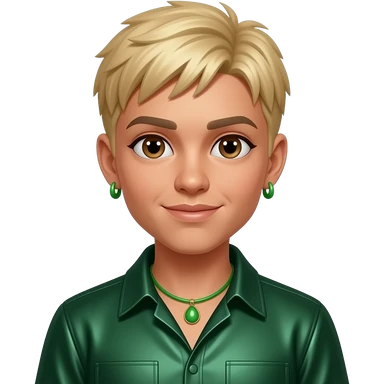 Feliz Green from The Next Kidz with light medium skin, brown eyes, short blonde tomboy hair, dark green metallic shirt, green necklace and earrings emoji