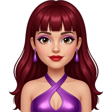 Nomz from The Next Kidz with white skin, hazel eyes, long dark red hair with bang, lilac eyeshadow, red lipstick, purple metallic halter dress, lilac earrings emoji