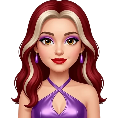 Nomz from The Next Kidz with white skin, hazel eyes, long dark red hair with platinum blonde highlights, lilac eyeshadow, red lipstick, purple metallic halter dress, lilac earrings emoji