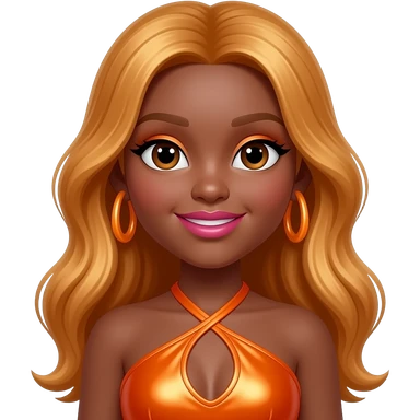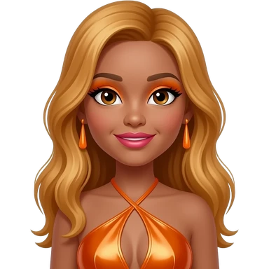 SayDazzle from The Next Kidz with medium skin, dark brown eyes, long ginger blonde hair, orange eyeshadow, pink lipstick, orange metallic halter dress, orange earrings emoji