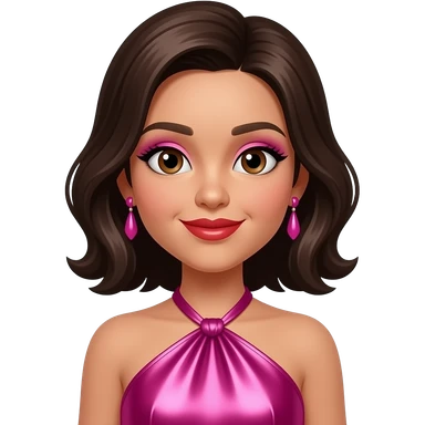 Kaye from The Next Kidz with light medium skin, brown eyes, medium dark brown hair, pink eyeshadow, red lipstick, hot pink metallic halter dress, pink earrings emoji