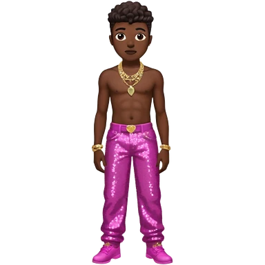 Lil Nas X with dark pink sequin baggy pants, shirtless with necklace emoji