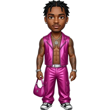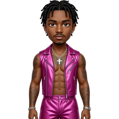 Lil Nas X with brown eyes, black hair, fuchsia metallic vest, fuchsia metallic baggy loose pants, shirtless with necklace and earrings emoji