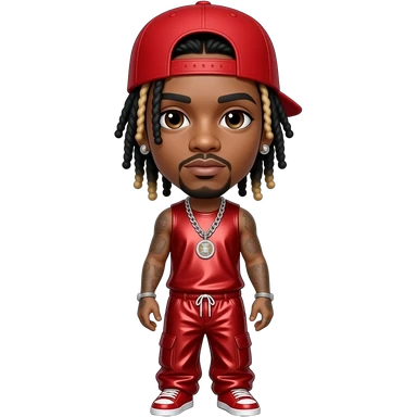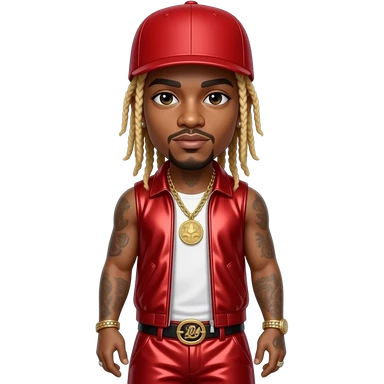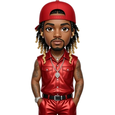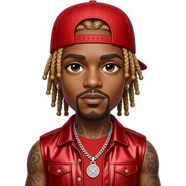 Lil Wayne with dark brown eyes, long black dreads with blonde ombre, red cap, red metallic hip-hop sleeveless shirt, red metallic hip-hop baggy pants, necklace and earrings emoji
