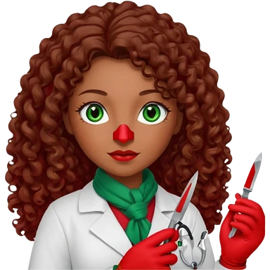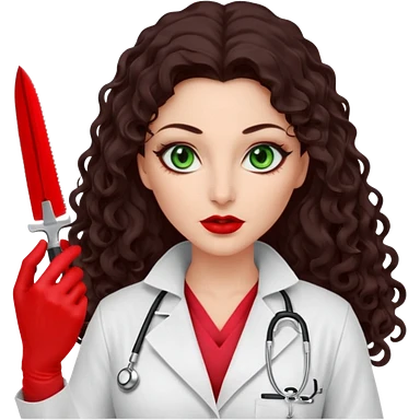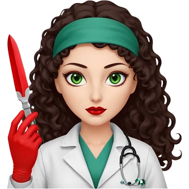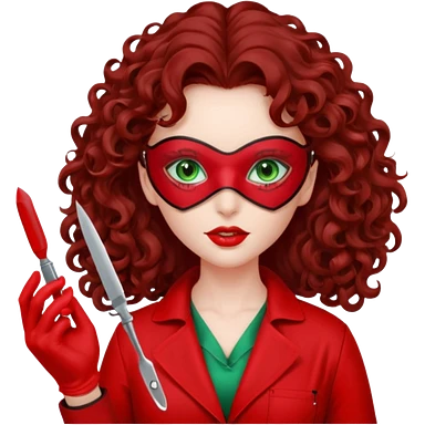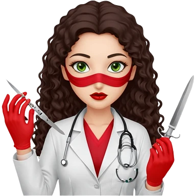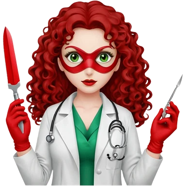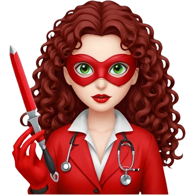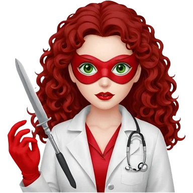Lilith scalpel sexy evil woman. She has green eyes. had brown long curly hair. evil surgeon kills holding scalpel. wears sexy doctor coat with red gloves. Covers nose, neck and mouth with Muslim red berka emoji | AI Emoji Generator