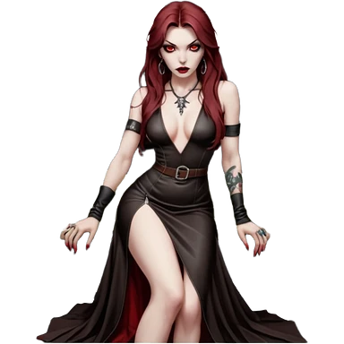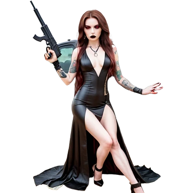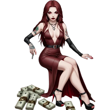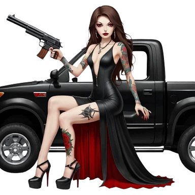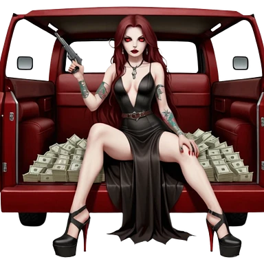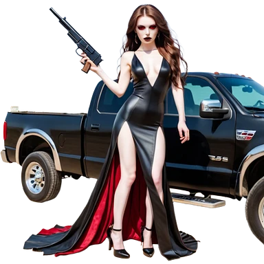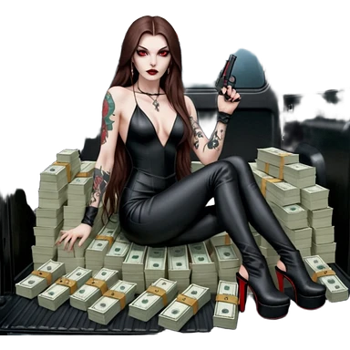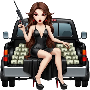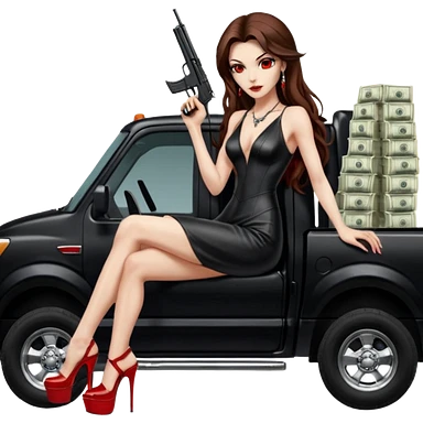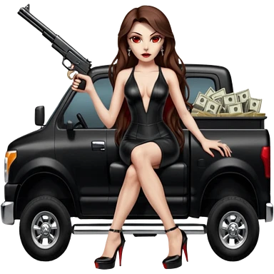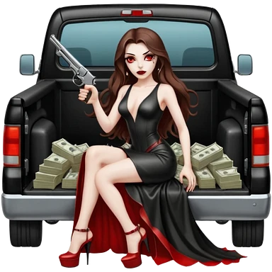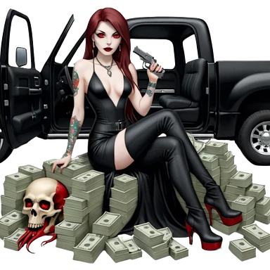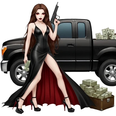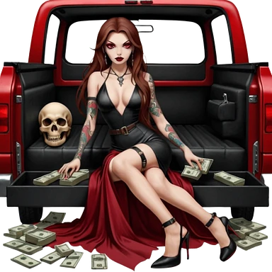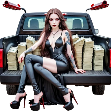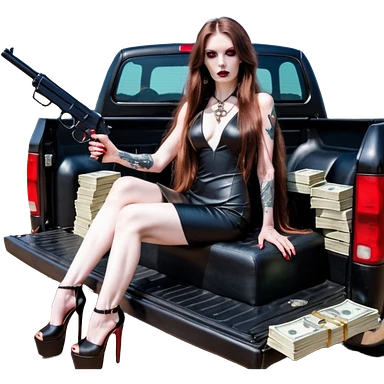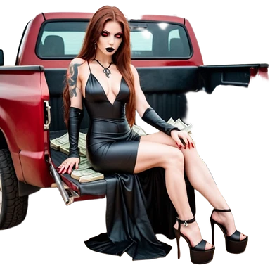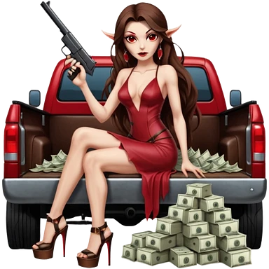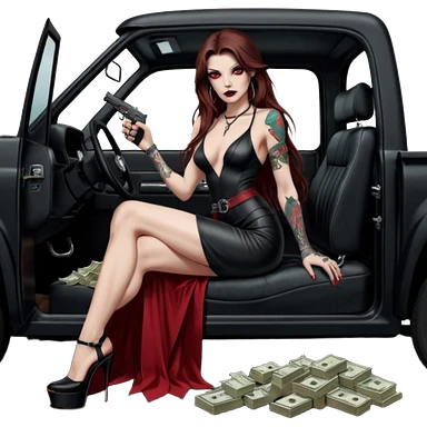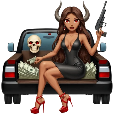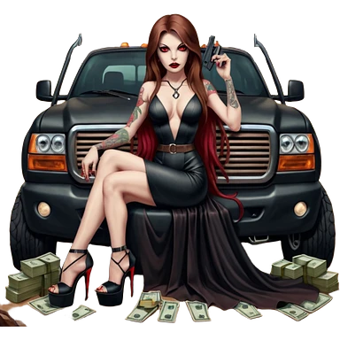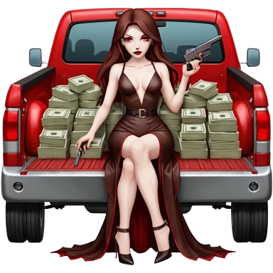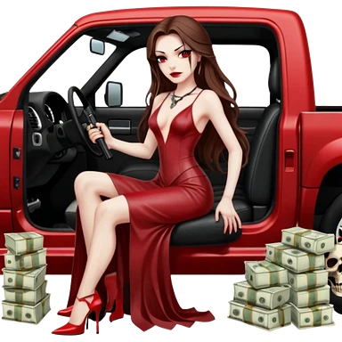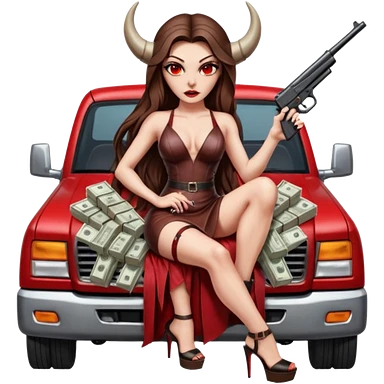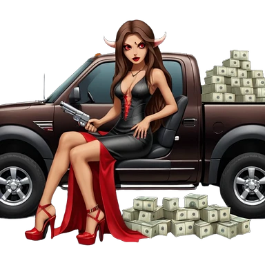 Lilith symbol red eye seductress evil long brown haired sexy succubus woman with leather long dress with slit, sitting in Big Large F350 pickup truck. Black Platform high heels on feet. Back of truck full of stacks of cash, and a man human skull with a gun in other handemoji