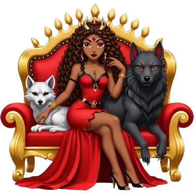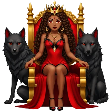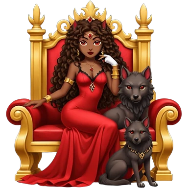 Lilith symbol seductress evil brown straight long hair haired, sexy succubus woman with red and black Chanel dress sitting on a Black and gold throne. A large black wolf laying beside he emoji | AI Emoji Generator