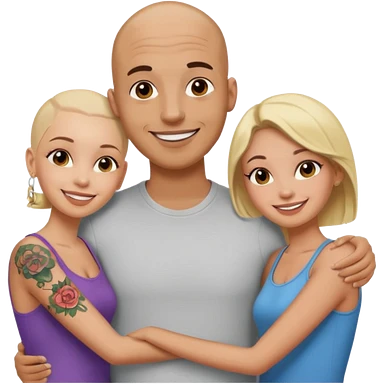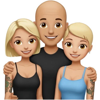 throuple tatted bald boyfriend with blonde girl friend and brunette girlfriend emoji
