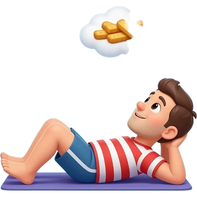A funny cartoon sticker of a person doing situps while dreaming of a fried snack, white border, flat vector. emoji