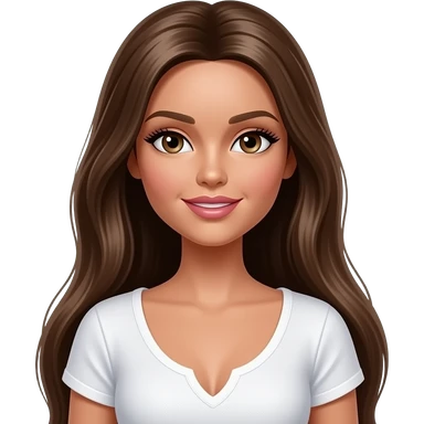 Long long brunette Barbie doll olive tan ish skin beautiful light brown hair and eyes pretty lips and natural eyeshadow and lipstick wearing a t shirt drop top emoji