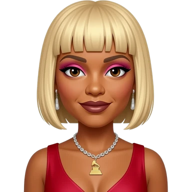 Tionne T-Boz Watkins from TLC with brown eyes, blonde micro-fringed bob hair, hot pink eyeshadow, dark brown lipstick, red grammy dress, necklace and earrings emoji