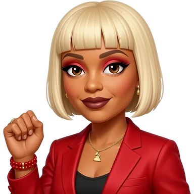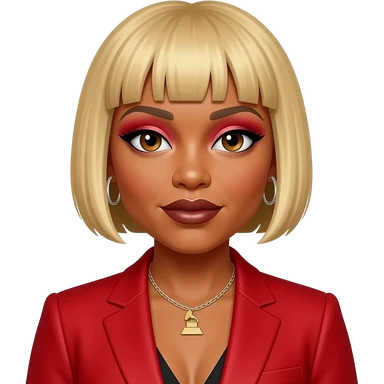 Tionne T-Boz Watkins from TLC with brown eyes, blonde micro-fringed bob hair, red eyeshadow, dark brown lipstick, red grammy suit jacket, red bralet, necklace and earrings emoji