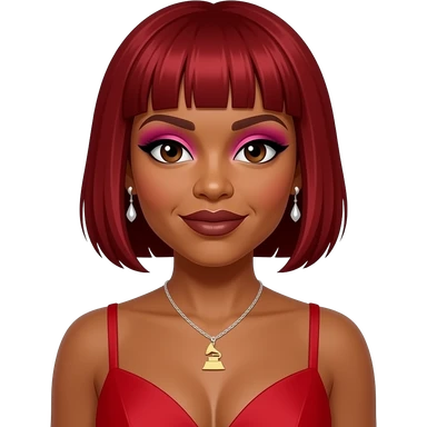 Tionne T-Boz Watkins from TLC with brown eyes, ruby red micro-fringed bob hair, hot pink eyeshadow, dark brown lipstick, red grammy dress, necklace and earrings emoji