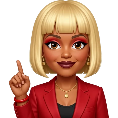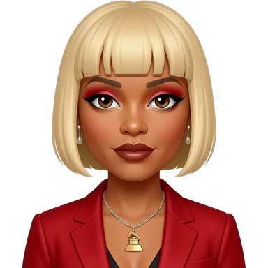 Tionne T-Boz Watkins from TLC with brown eyes, blonde micro-fringed bob hair, red eyeshadow, dark brown lipstick, red grammy suit jacket, necklace and earrings emoji