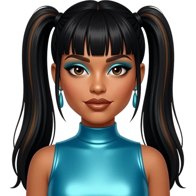 Lisa Left Eye Lopes from TLC with dark brown eyes, black straight three ponytail hair with bang, cyan eyeshadow, dark brown lipstick, cyan metallic halter dress, earrings emoji