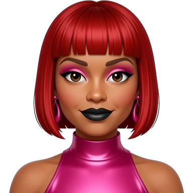 Tionne T-Boz Watkins from TLC with dark brown eyes, bright red tapered pixie cut hair, pink eyeshadow, black lipstick, hot pink metallic high neck dress, pink earrings emoji